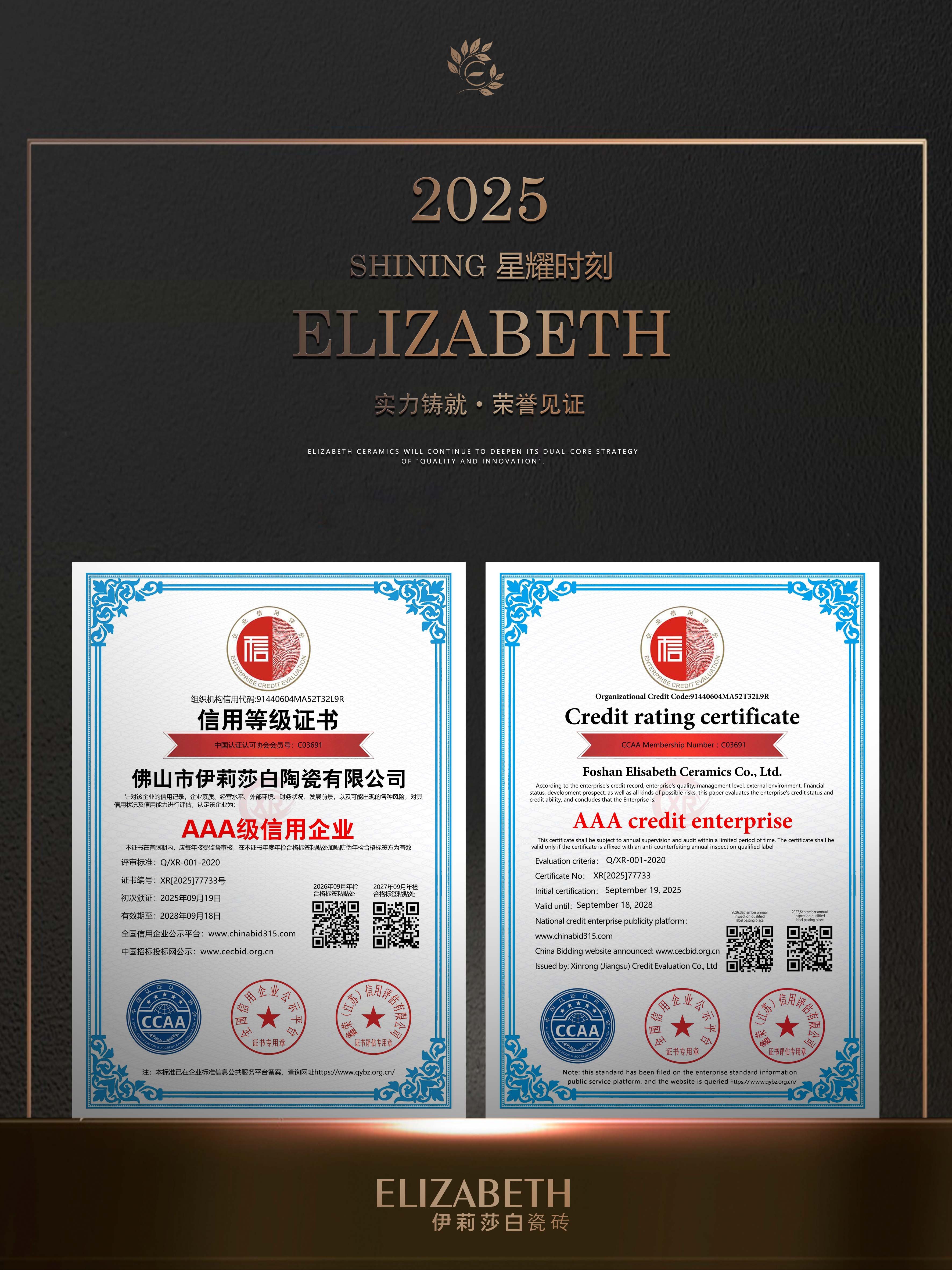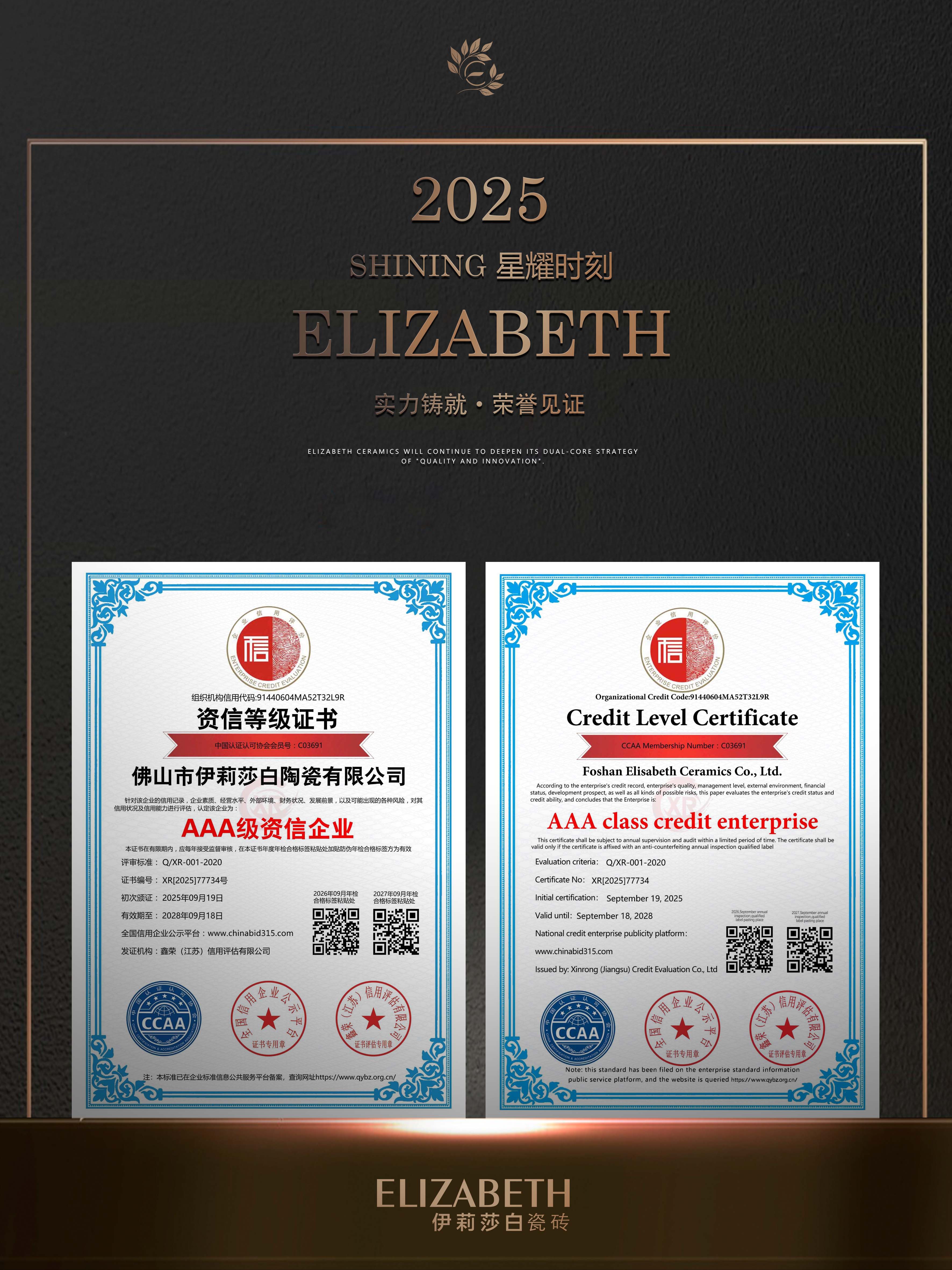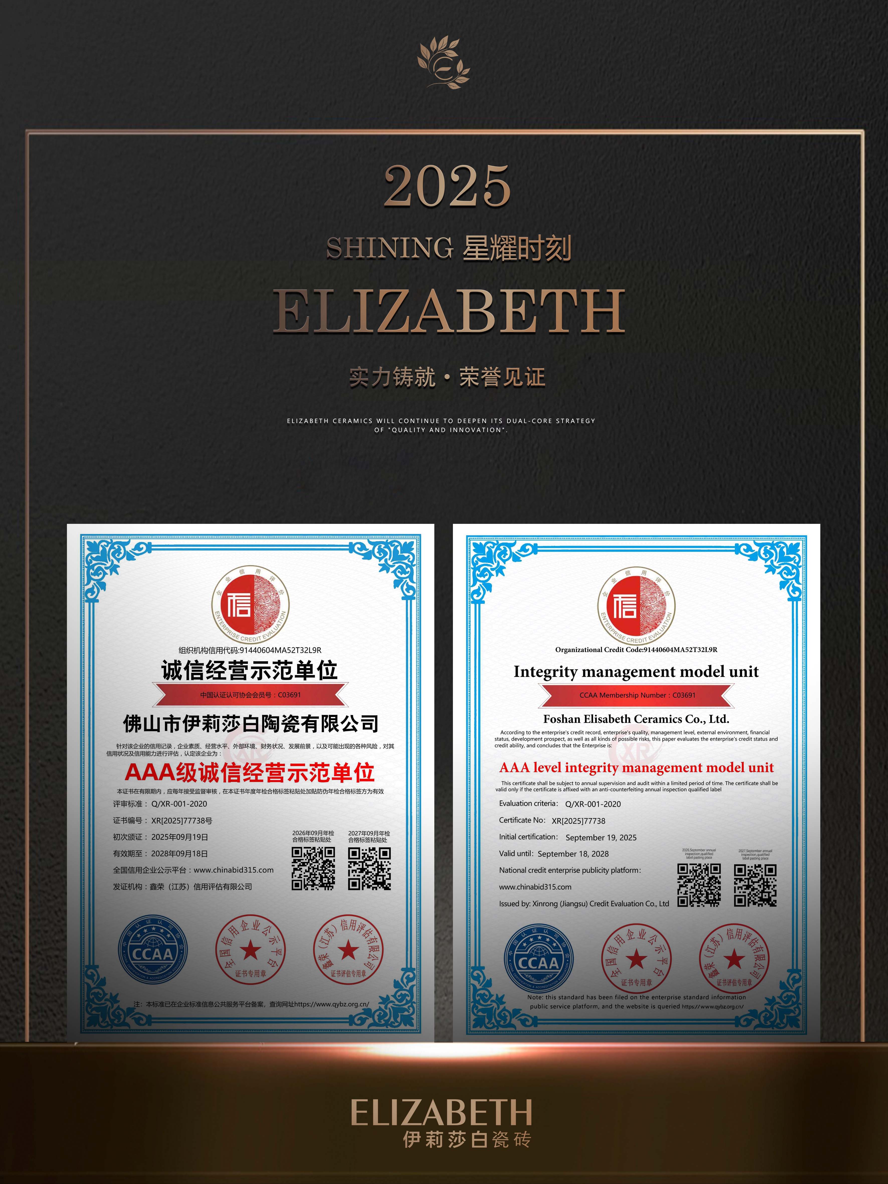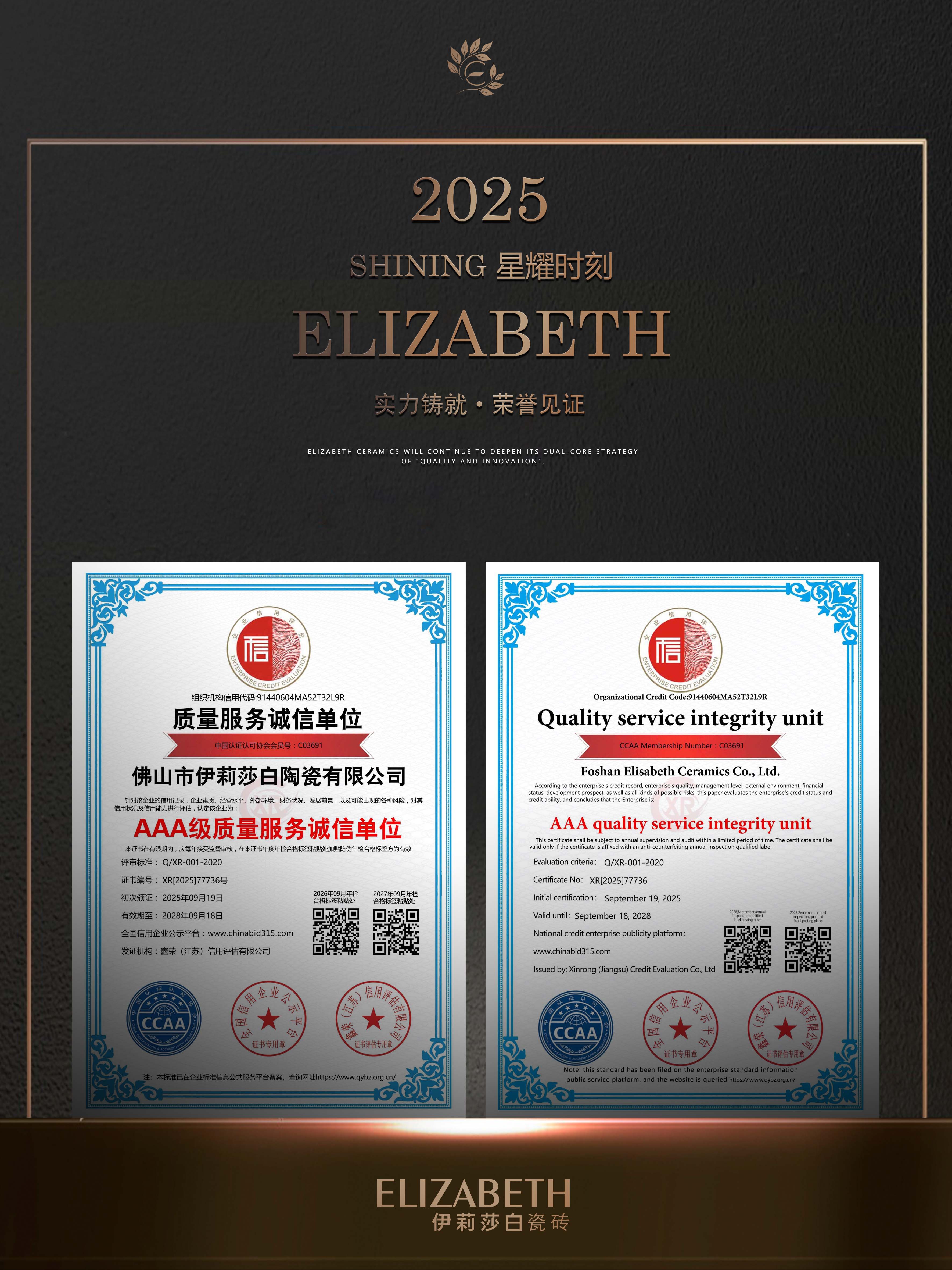 With outstanding credit performance, solid corporate quality and quality services, the brand has won a series of key AAA-level corporate certifications:AAA classservicesand trustworthy enterprise、AAA class contract and trustworthy enterprise、AAA class quality and trustworthy enterprise、AAA level integrity management model unit、AAA quality service integrity unit、AAA credit suppliers.AAA is the highest corporate credit rating,it is both authoritative recognition of the brand’s strength and solid credit assurance for consumers.For years, ELIZABETH Ceramics has strictly controlled quality,high-standard full-process management, adhered to integrity service, and wholeheartedly solved consumers’ problems.